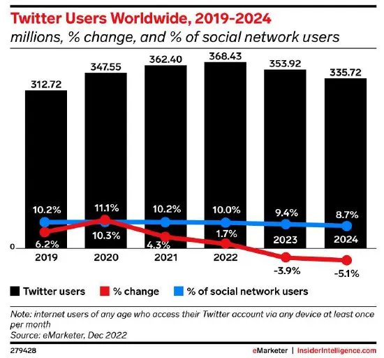 It's predicted that Twitter will shed 32.7M users by the end of 2024. The biggest cuts will come from the US, particularly those under 25 and over 45. (AdWeek)