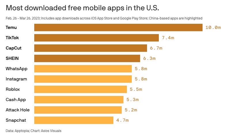Four of the top 10 most-downloaded apps in the US are owned by Chinese companies. (Axios)