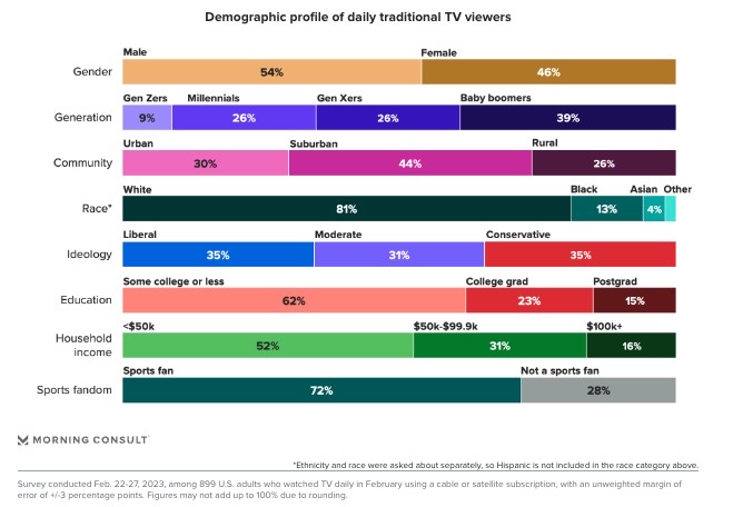 Over a quarter (27%) of US Gen Z adults and 34% of millennials watch linear TV daily, and 78% who watch TV that often have at least one video streaming subscription. (Morning Consult)