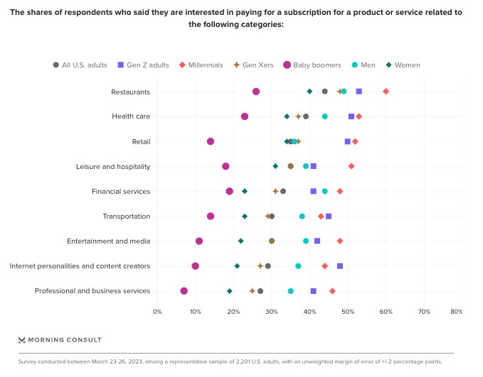 Nearly half of US Gen Zers (46%) and millennials (49%) are interested in subscriptions, compared with about a third (34%) of the general public. (Morning Consult)
