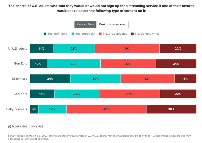 The majority of US millennials would sign up for a streaming service if one of their favorite musicians were to release a concert on that platform. (Morning Consult)