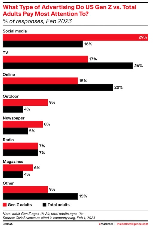 US Gen Z adults are more likely to pay attention to social media advertising than US adults overall. (Insider)