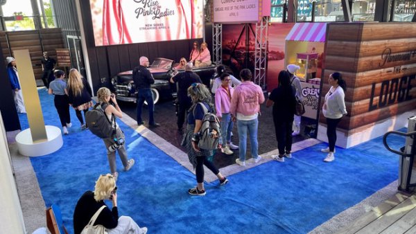 Paramount+'s lodge was designed to reflect the streamer's "mountain of entertainment" concept, with each level showcasing distinct themes. The first floor resembled a ski lodge, complete with leather chairs, a bar, and a "Grease"-themed car where visitors could don pink jackets like those worn by the Pink Ladies. Meanwhile, the top floor featured a photo opportunity with the Vince Lombardi Trophy and a chance to create your own unique piece of vinyl artwork. The rooftop bar was themed around "1923," the prequel to "Yellowstone."