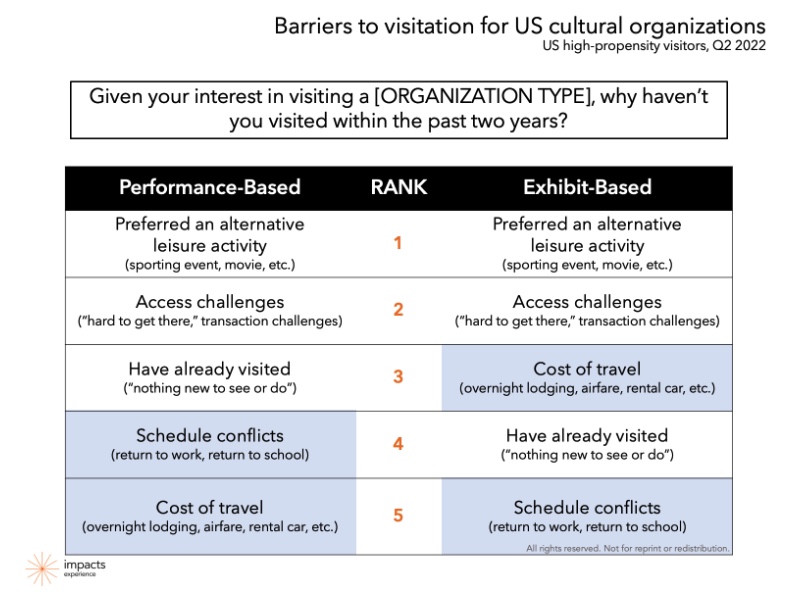 Cost of travel is a new primary barrier of attendance for US cultural organizations, along with schedule conflicts. The amount of money people expect to spend on a visit has decreased by 12.5% for exhibit-based organizations and 28.6% for performance-based organizations compared to 2019. (Colleendilen)