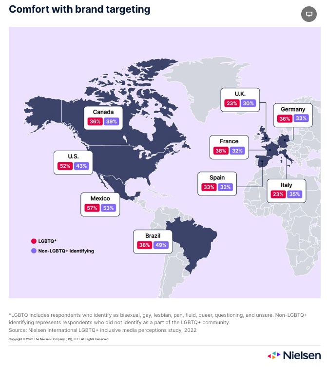 LGBTQ+ communities in Mexico and the US are the most comfortable with inclusive campaigns, with more than half being open to brand targeting. (Nielsen)