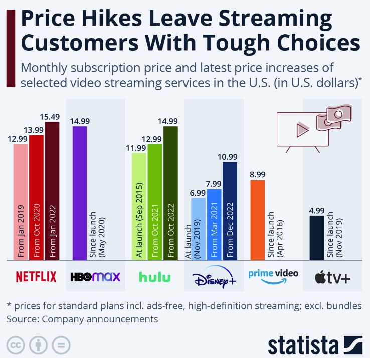 Two thirds of US adults would cut back on subscriptions to save money in times of high inflation, and price increases from streamers could contribute to an average subscription decrease. (Statista)