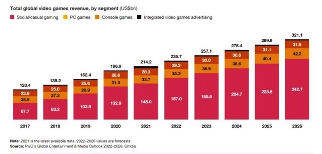 Video games industry revenue (excluding esports) is expected to reach $321B by 2026. Social games will account for 76% of this revenue ($243B). (Mibidictum)