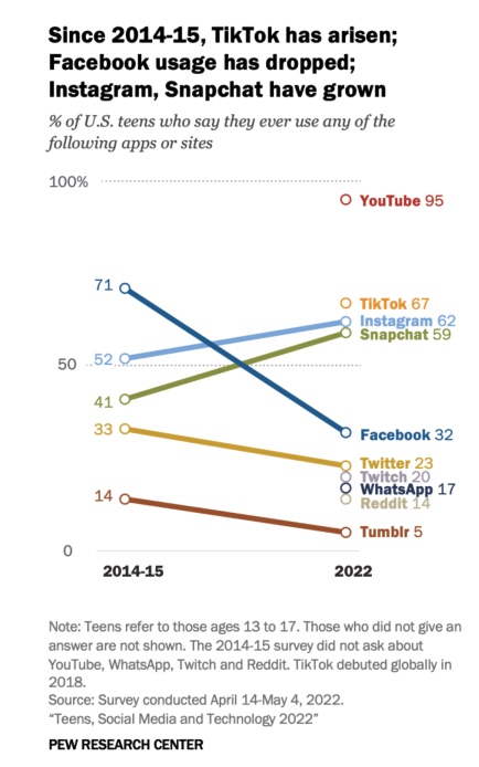 About a third of teens aged 13-17 use Facebook, down from 71% in a previous survey. However, 62% of teens use Instagram, up from 52% in 2015. (Tech Crunch)