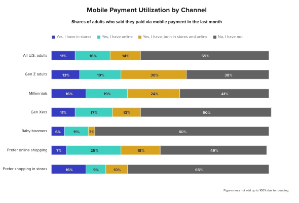 Over 40% of US adults have used mobile payment in the last month. 16% of those who prefer in-store shopping have used in-store mobile payments, compared with 7% of those who prefer shopping online. (Morning Consult)