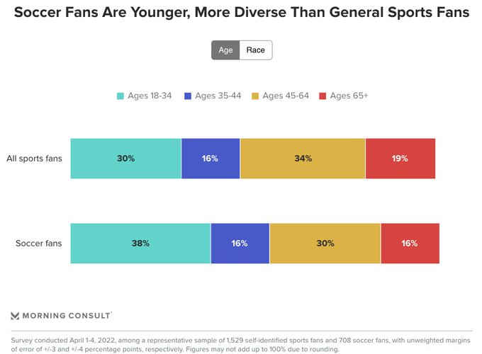 Enthusiasm for soccer (football, outside of the US) is higher among younger generations than the general US population, with fans 18-34 accounting for over a third of total soccer fans. (Morning Consult)