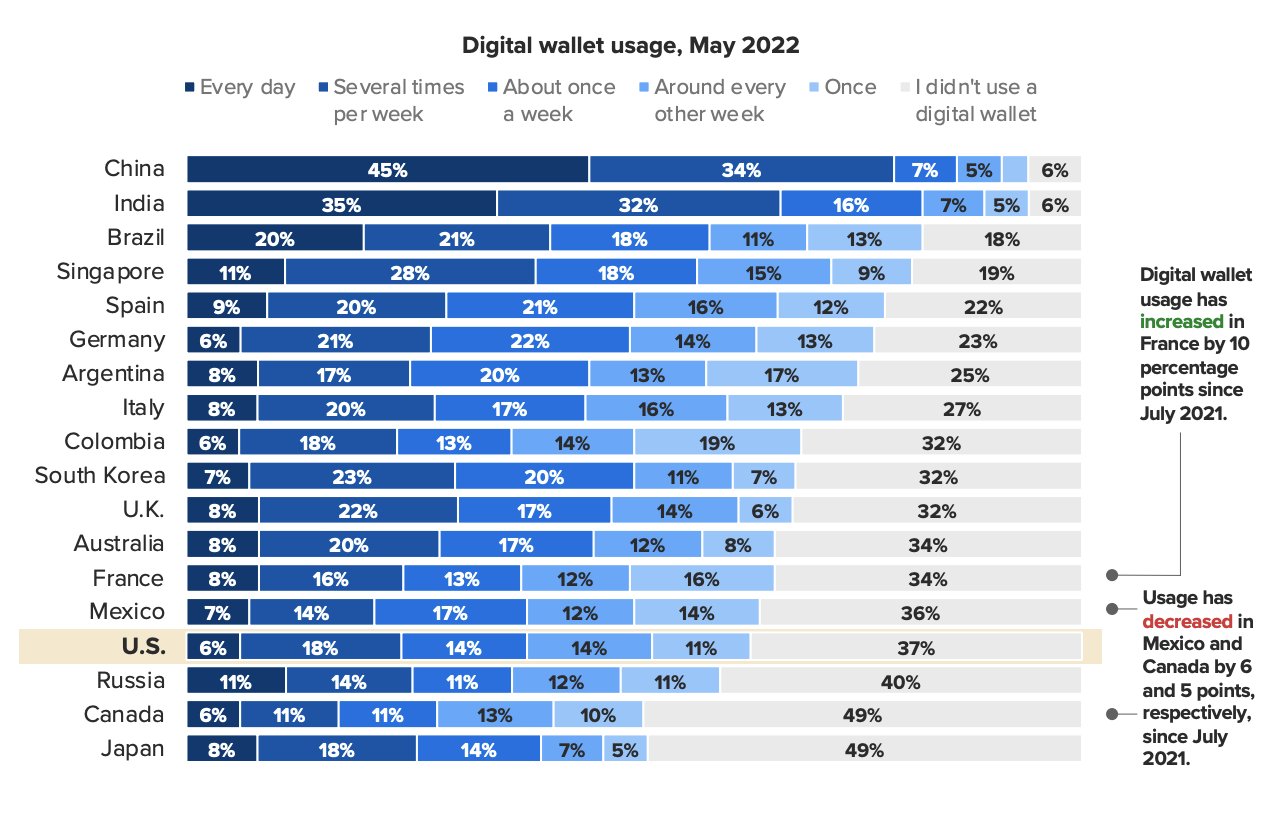 Almost half of people in China use digital wallets every day. China, India and Brazil report the highest digital wallet usage overall. (Morning Consult)