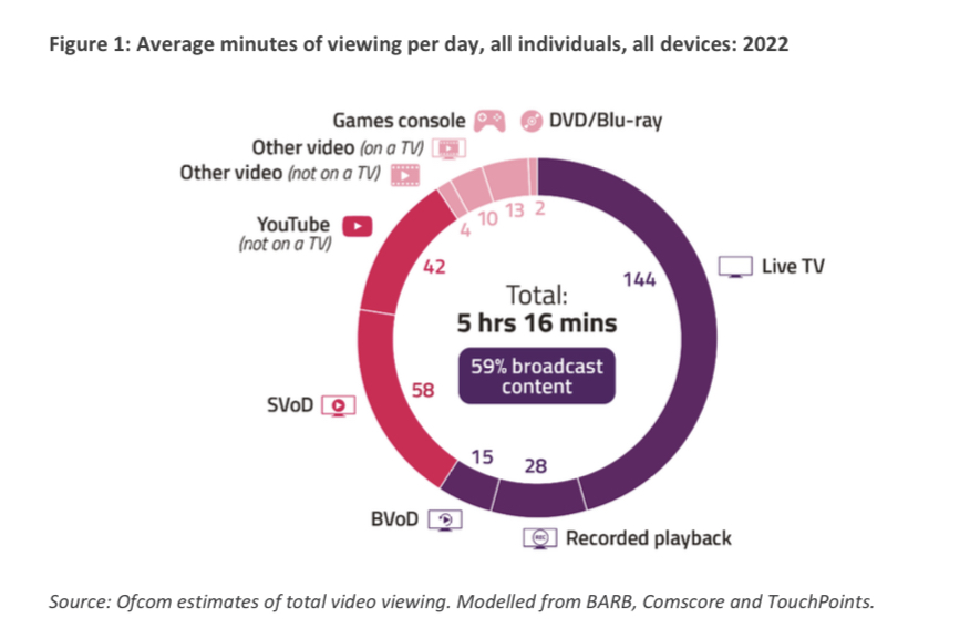 In 2022, people in the UK spent an average of 5 hours and 16 minutes every day watching video content. Subscriber VOD is the second-most watched type of video content behind broadcast. (Twitter)