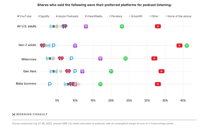 Spotify is Gen Z’s preferred podcast destination, but YouTube is not far behind. (Morning Consult)