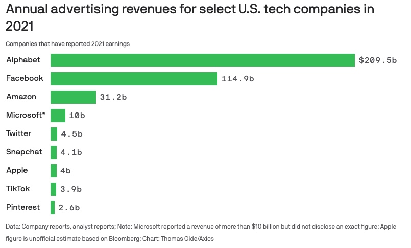 Alphabet reported the highest 2021 ad revenues of any tech company, followed by Facebook. Apple’s move to limit the way apps track user behavior may have kneecapped competitors like Meta. (Axios)