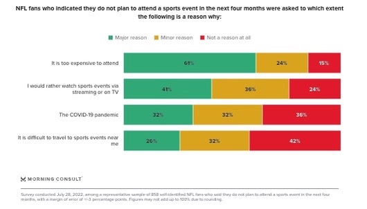 3 in 5 NFL fans won't attend games because it's too expensive. Still, nearly 7 in 10 fans believe the price of an NFL ticket is reasonable. (Morning Consult)