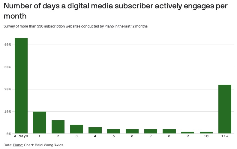Over 43% of digital media subscribers become inactive the day after they subscribe, up from 39% in 2021. (Axios)