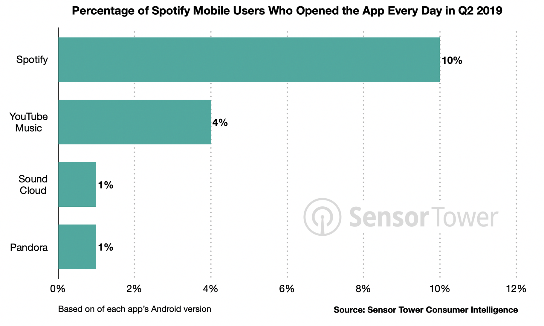 One in ten Spotify users engages with the app every day. The next closest competitor is YouTube, with 4% of users engaging daily. (Sensor Tower)
