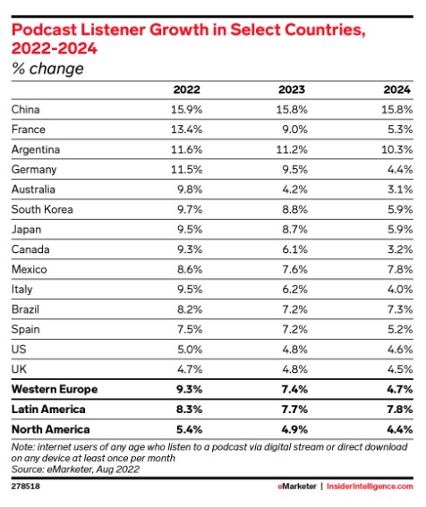 Podcast listener growth is expected to slow globally in the post-pandemic climate. (Insider)