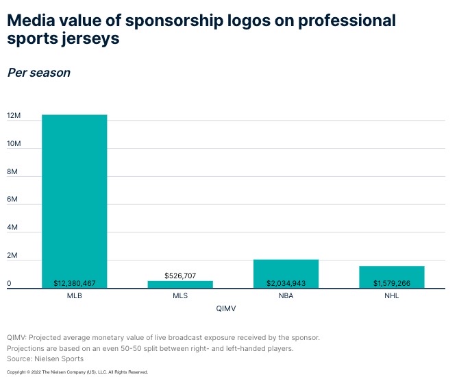 The average on-screen Quality Index Media Value of a sleeve patch for the full regular MLB season is projected to exceed $12.4M, more than any other professional sports jersey sponsorship in the US. (Nielsen)