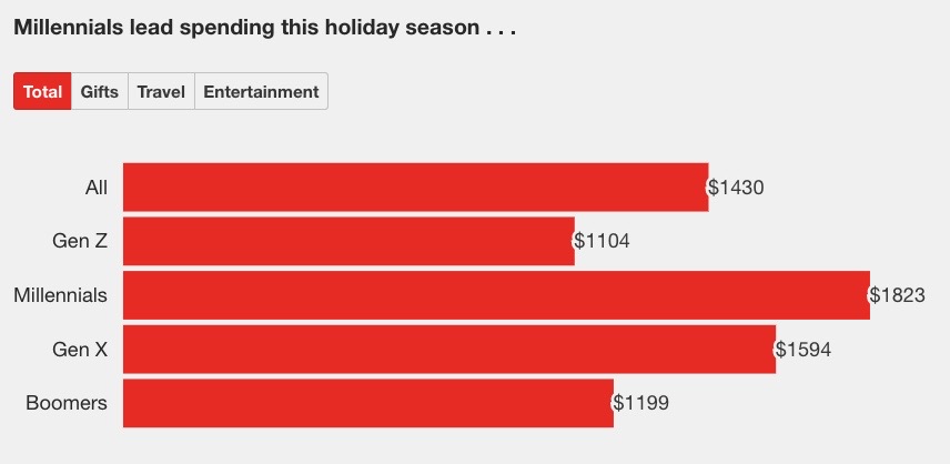 US millennials plan to spend the most this holiday season across gifts, travel, and entertainment. (PWC)