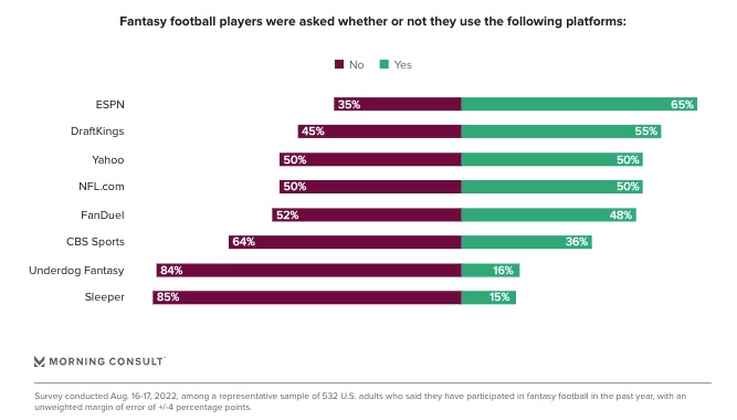 ESPN and DraftKings are the most popular fantasy sports platforms among US adults, with 65% and 55% of fantasy sports players who participate in football using the platforms respectively. (Morning Consult)