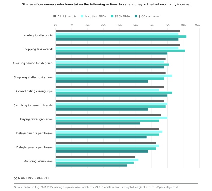 For 85% percent of US adults, rising inflation has impacted the way they shop, prompting them to look for deals, discounts and coupons. (Morning Consult)