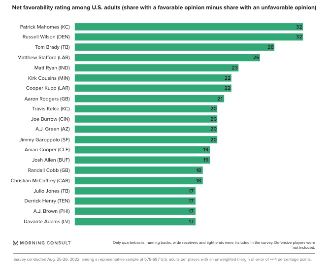 Ahead of the 2022 season, Kansas City Chiefs quarterback Patrick Mahomes is the NFL’s most popular player among US adults. (Morning Consult)