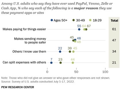 PayPal is used by 57% of US adults, while 38% use Venmo, 36% use Zelle, and 25% use CashApp. 61% of those who have ever used a payment platform do so because it makes paying for things easier. (PewResearch)