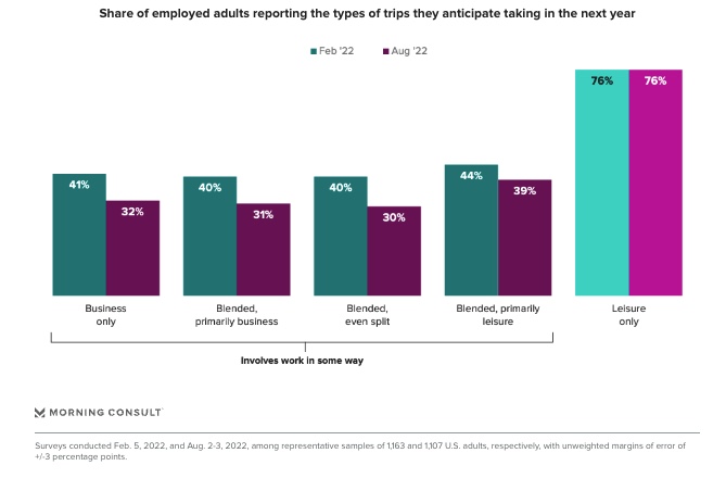 The share of US adults that would take a trip involving work dropped several points between February and August. (Morning Consult)