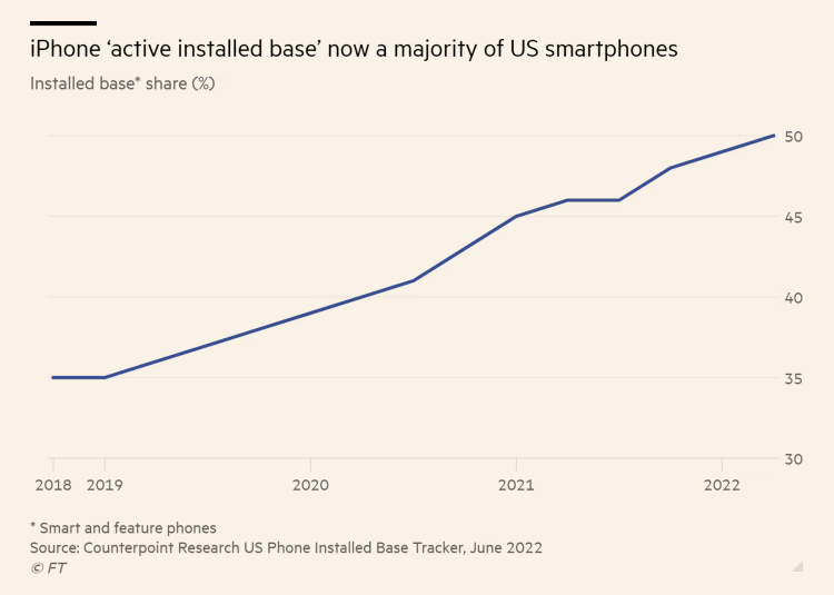 iPhones have overtaken Android devices, claiming 50% of the US smartphone user market share. (Financial Times)