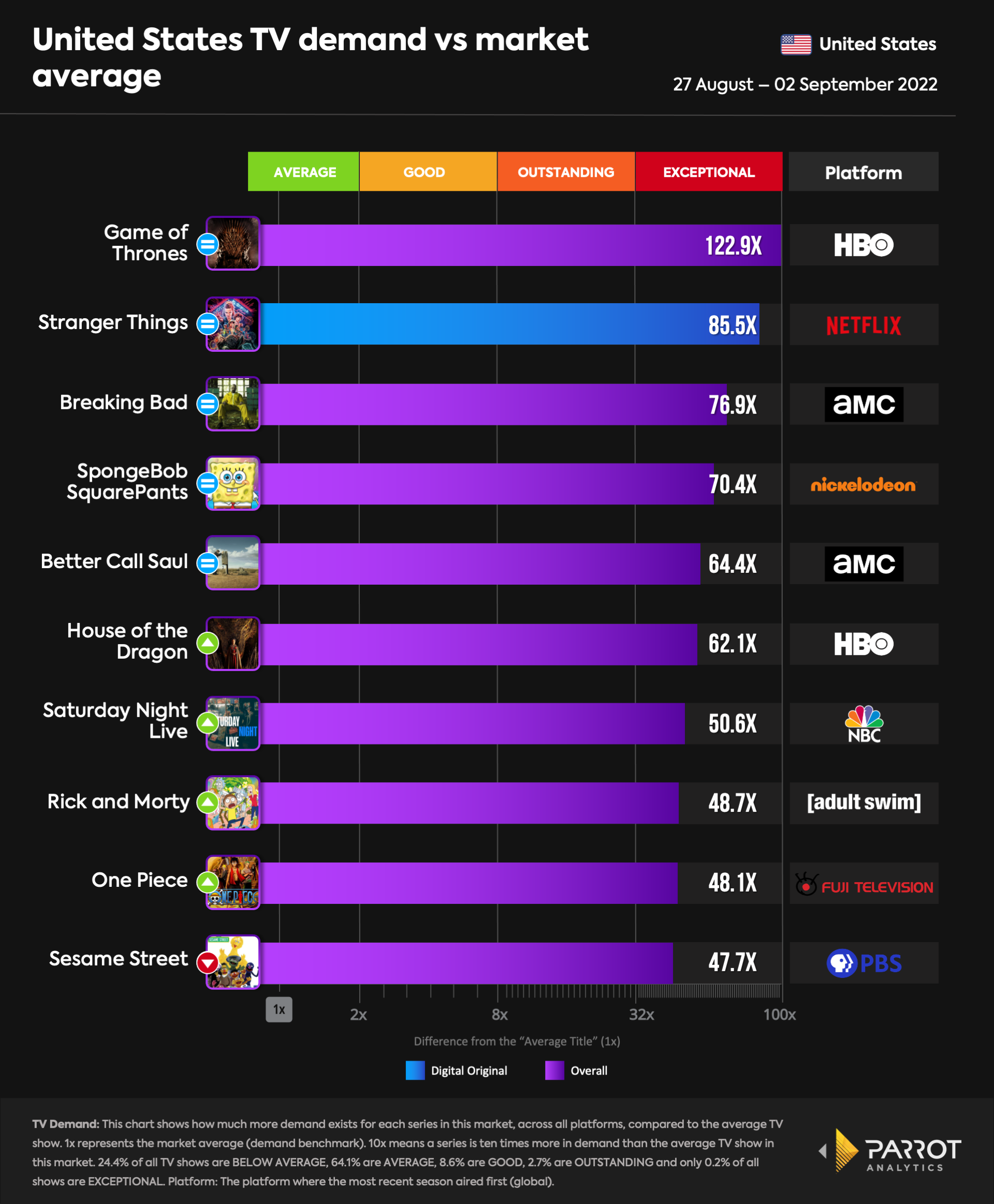 HBO’s House of the Dragon saw a 22% increase in demand following its second episode, helping it maintain its status as the most in-demand breakout show. (Parrot Analytics)